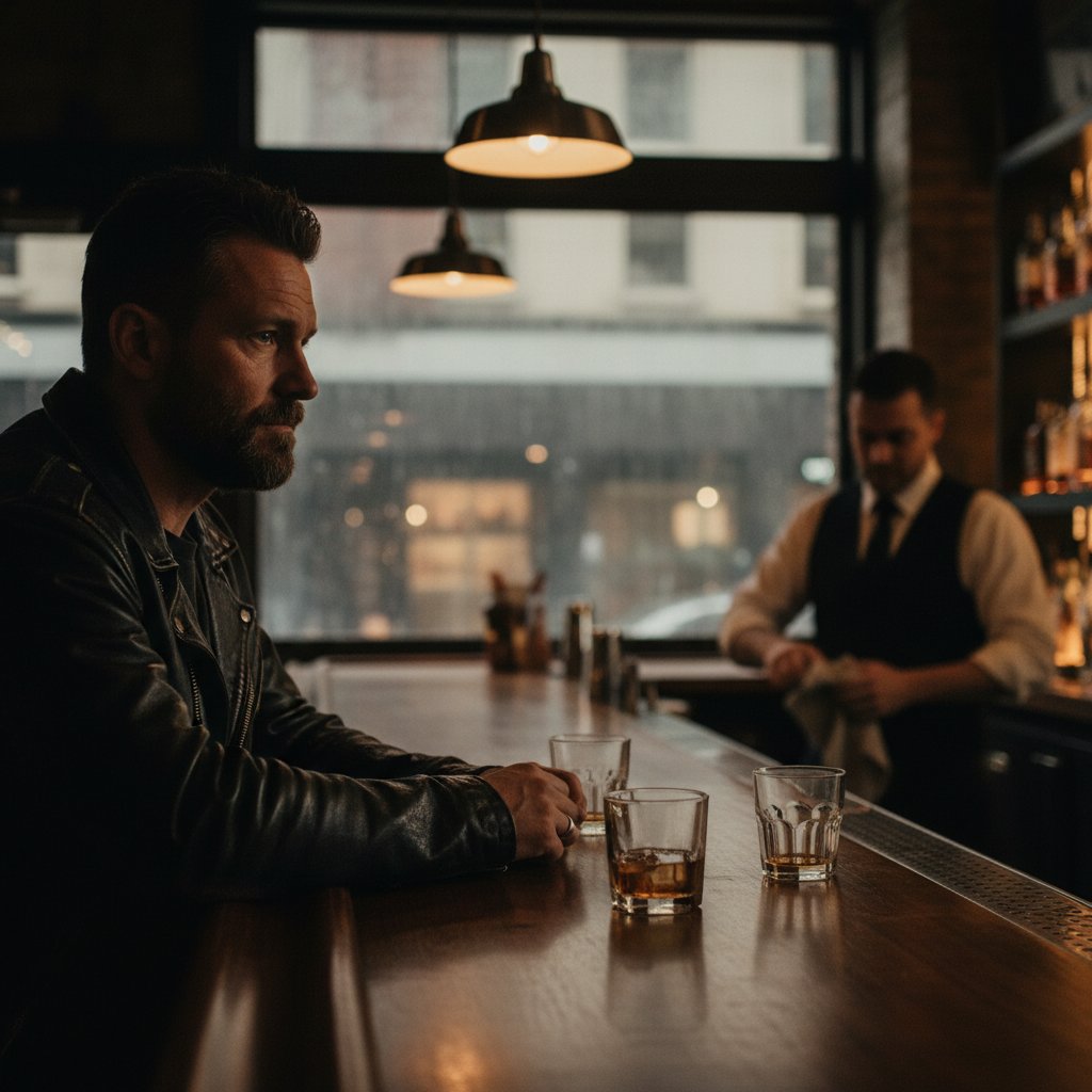 Мужчина лет сорока сидит один за барной стойкой, перед ним два пустых стакана, третий наполовину полон. Тусклый янтарный свет от подсвеченных бутылок виски. Бармен протирает стаканы на фоне мягкого размытия. Он смотрит в никуда — просто вдаль. Кожаная куртка, трехдневная щетина, кольцо на пальце. Съемка с уровня стойки, объектив 50 мм, малая глубина резкости. Мрачная, нуарная атмосфера, никакой драмы — просто мужчина и тихий бар в час ночи.