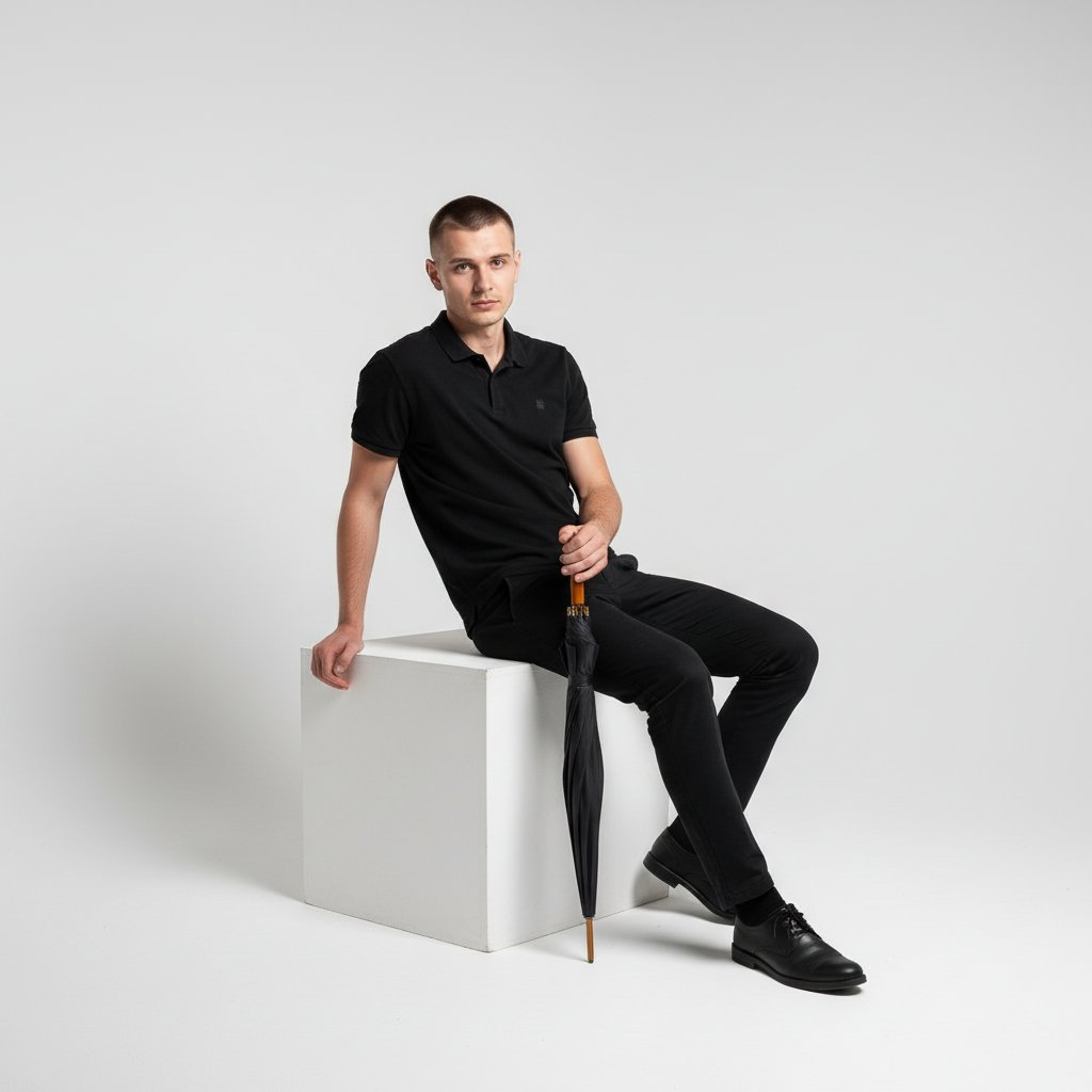 Мужчина в черной футболке-поло, полулежа на белом кубе в студии с циклорамой. Одна нога касается пола, в руке — зонт. Взгляд направлен в камеру, поза выражает задумчивость, общая атмосфера сдержанная.