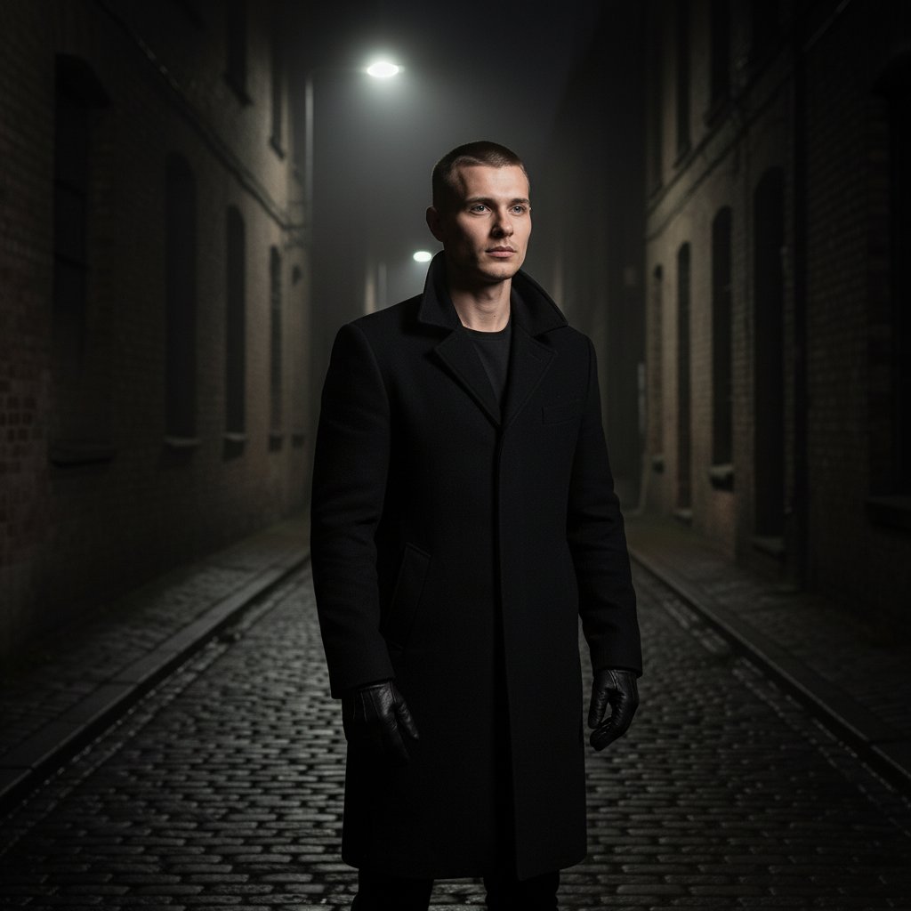 Фигура мужчины в длинном чёрном пальто и кожаных перчатках в пустом переулке. Слабый свет фонарей выхватывает его из темноты, создавая глубокие тени. Одна сторона лица освещена, другая скрыта мраком, подчеркивая атмосферу уединенности.