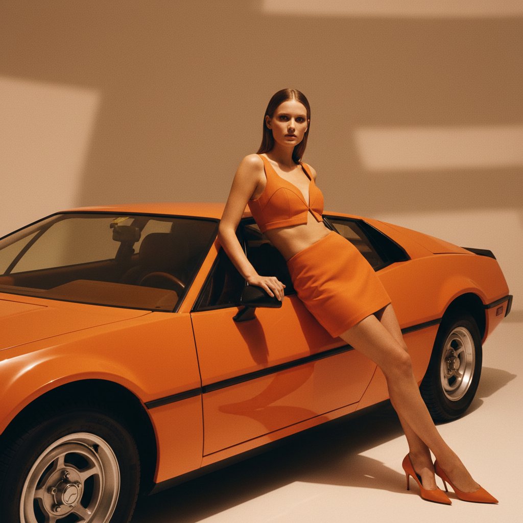 Создай портрет, не меняя черты лица. Фэшн-фотография модели рядом с ярко-оранжевым спортивным автомобилем 1970-х годов с угловатым дизайном и ретрофутуристической эстетикой. Она прислоняется к автомобилю, создавая динамичную позу. На женщине наряд в оранжевых оттенках: короткий топ и юбка с геометрическим кроем. Тёплая монохромная палитра, минималистичный фон с мягкими тенями. Гиперреалистичный редакторский стиль, 8k, высокая детализация. 9:16