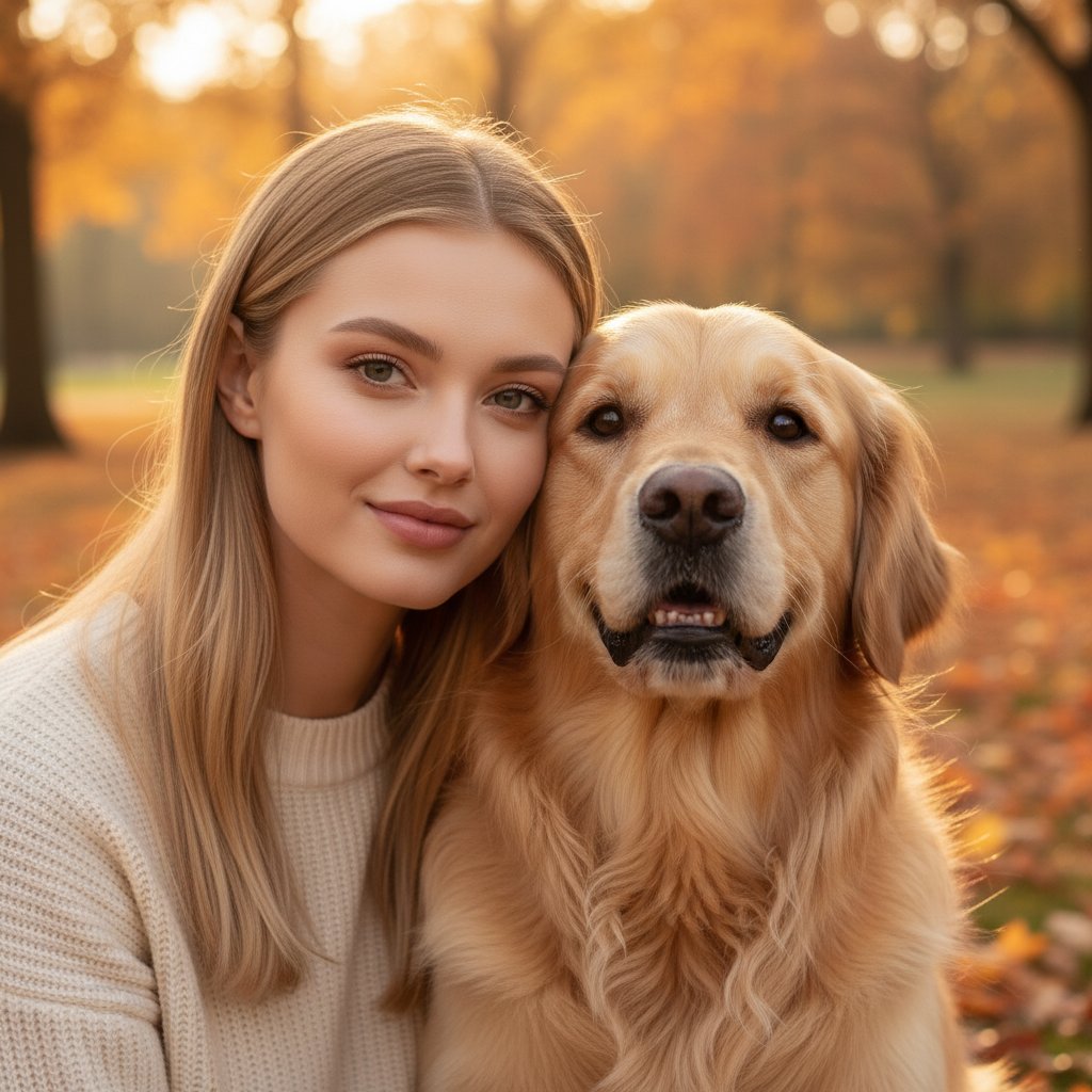 Женщина и золотистый ретривер, их лица близко друг к другу. Собака смотрит в объектив, её шерсть освещена мягким осенним солнцем. На заднем плане — размытый осенний парк с опавшими листьями.