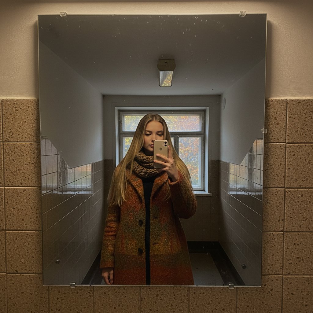 Девушка в пальто осенних тонов фотографирует себя в зеркале, расположенном в подъезде. За ее спиной видны стены, облицованные плиткой, и проникающий сквозь стекло осенний свет.