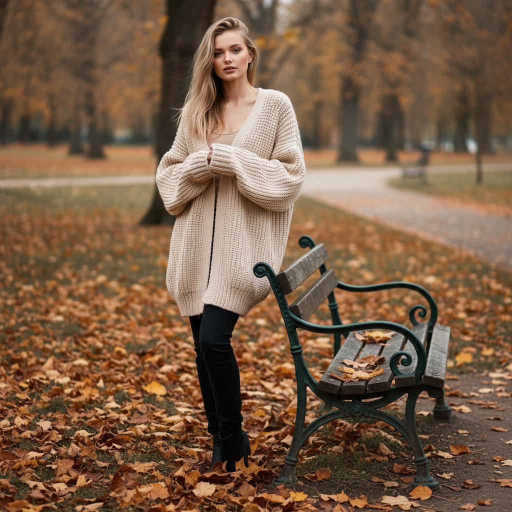 Дама в объемном кардигане у старинной парковой скамьи, вокруг опавшие листья, атмосфера осени.