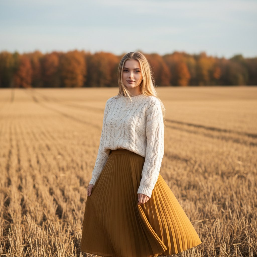 Девушка в уютном свитере и струящейся юбке позирует на фоне золотистых осенних полей, на дальнем плане виднеются деревья.