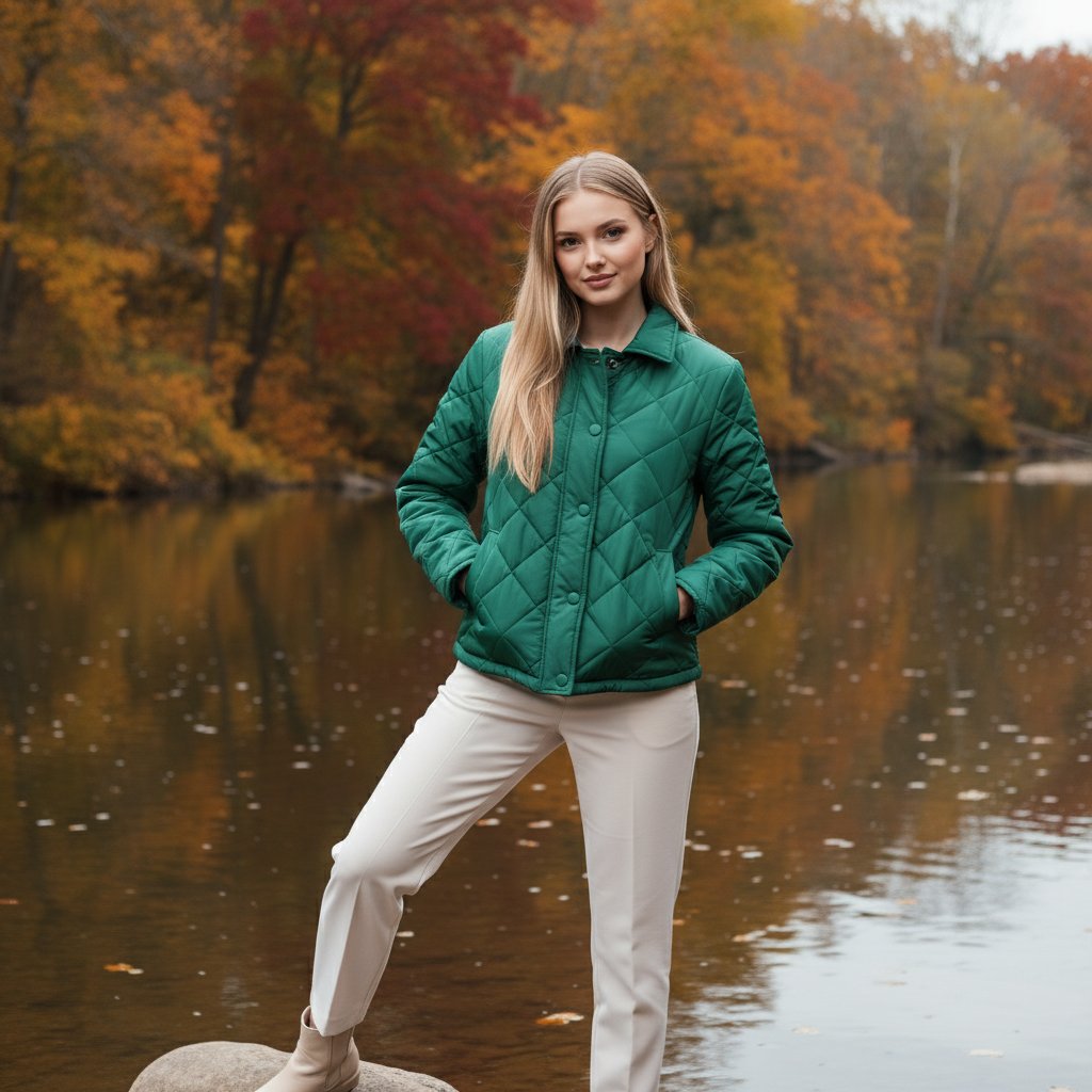 Девушка в стильной изумрудной куртке и светлых брюках позирует у спокойной речки. Задний план украшен осенними деревьями с листвой золотых и багряных оттенков. Она ставит ногу на камень, руки спрятаны в карманы, корпус немного наклонен, взгляд прямой и дружелюбный.