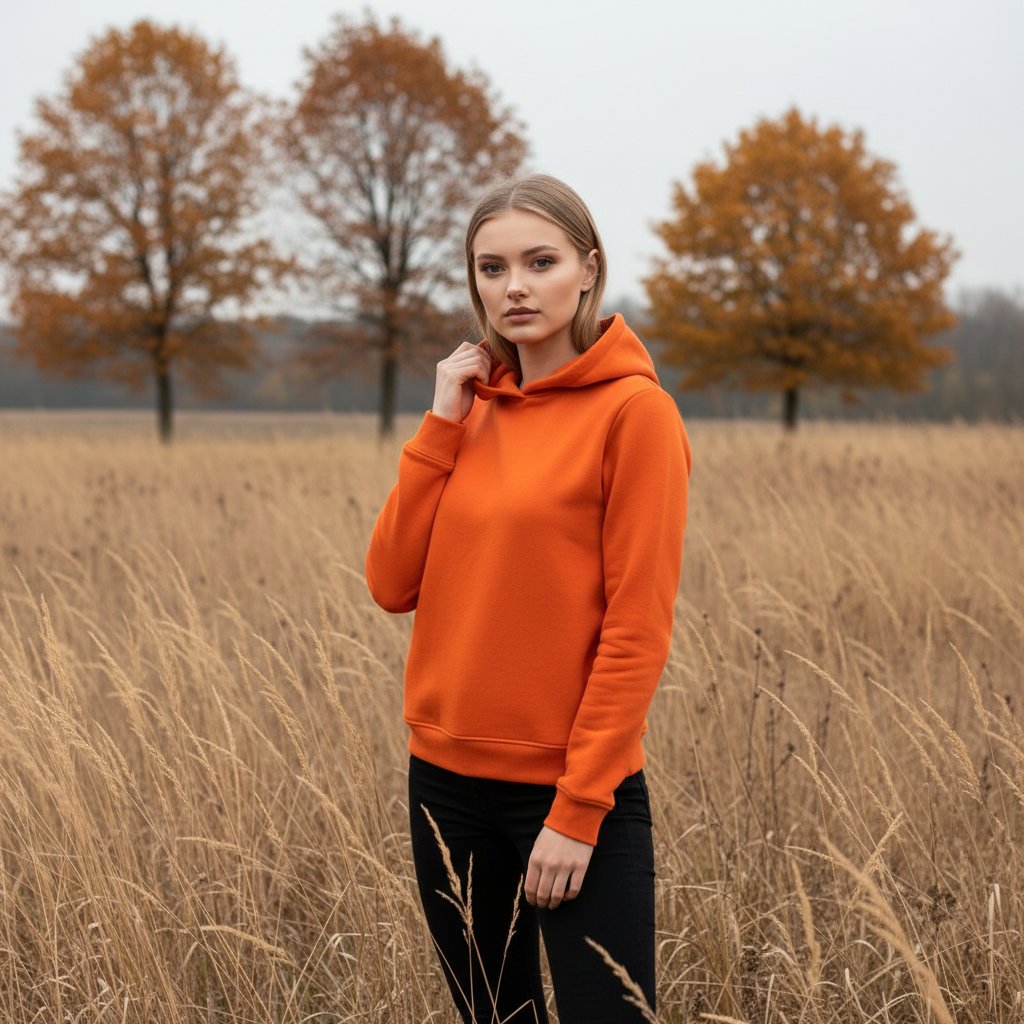 Девушка в лаконичном худи насыщенного оранжевого цвета и черных облегающих брюках позирует в поле высокой сухой травы. Позади виднеются деревья с ржаво-желтой листвой. Она слегка развернулась, одна рука касается капюшона, другая свободно опущена. Взгляд прямой, направлен в объектив.