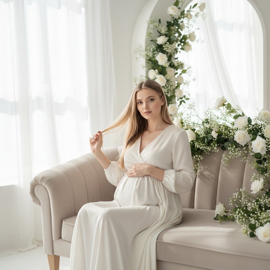 Беременная женщина в струящемся белом шёлковом платье расположилась на уютном диване в залитой светом студии. Одна рука нежно обнимает живот, другая играет с прядями волос. За ней — лёгкие шторы и арка, украшенная цветами. Мягкое естественное освещение подчёркивает её умиротворение и хрупкость.