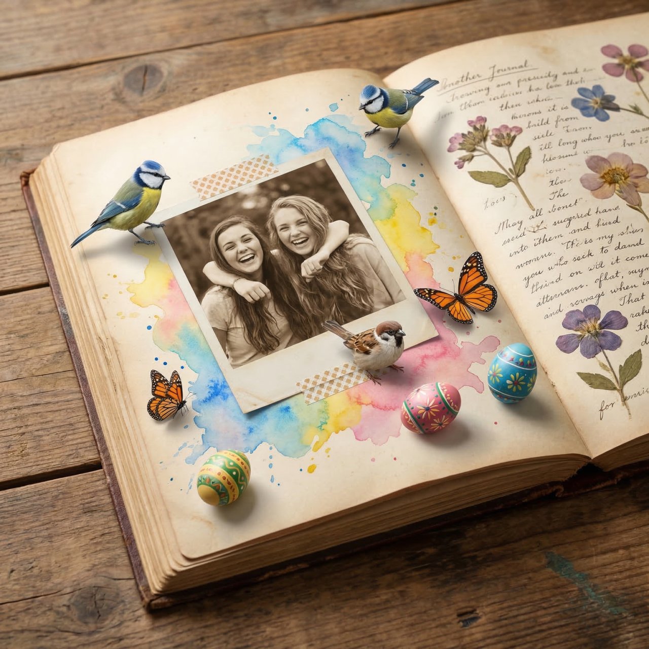 NanoBanana ProMixed media art aesthetic. A vintage journal page lying on a wooden table. A realistic photograph of [Insert Photo Subject / two friends laughing] taped to the page. Surrounding the photo are vibrant watercolor splashes that magically transform into 3D realistic spring birds, butterflies, and beautifully detailed Easter eggs rolling off the paper. Joyful, nostalgic, heartwarming, creative, soft studio lighting, masterpiece --ar 1:1 Перевод/Суть: Эстетика смешанных медиа. Винтажный дневник. Ваша фотография прикреплена к странице, а вокруг акварельные брызги магически превращаются в 3D птиц, бабочек и пасхальные яйца.