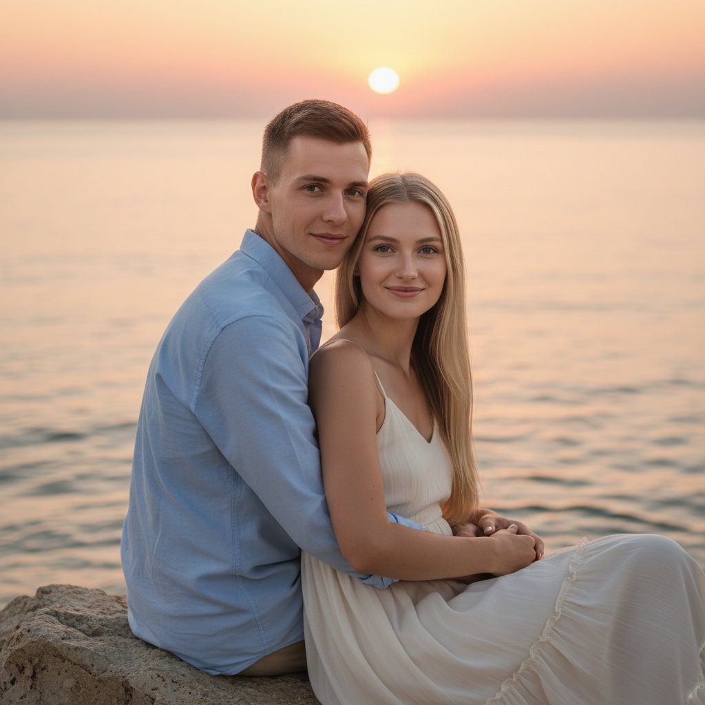Влюбленная пара сидит на берегу моря, расположившись на большом камне. Молодой человек нежно обнимает девушку за плечи. Оба смотрят прямо в объектив, озаренные мягким светом заката, и улыбаются. Спокойная морская гладь простирается позади них. Атмосфера наполнена нежностью и романтикой. Крупный план.