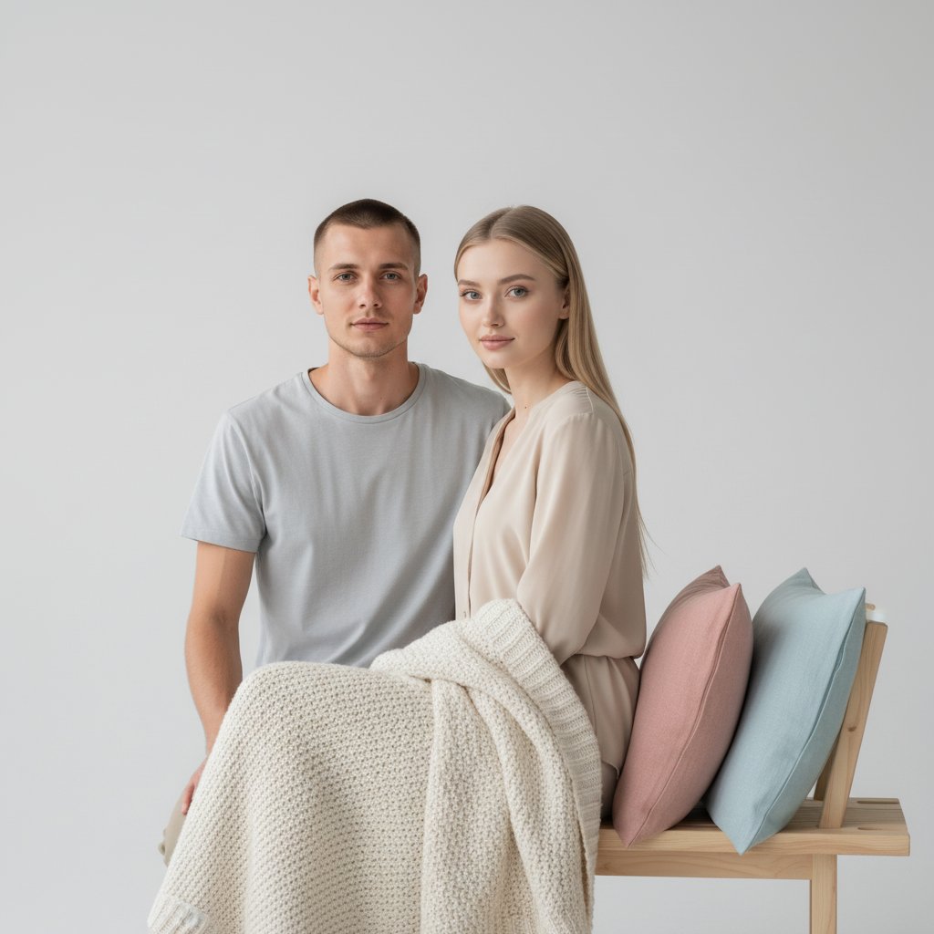 Молодая пара, сидящая рядом на деревянной скамье в залитой светом минималистичной студии. Они смотрят прямо в объектив, их лица мягко освещены. Одежда в нежных пастельных тонах. Несколько текстильных элементов создают атмосферу уюта. Изображение передает чувство гармонии и доверия.
