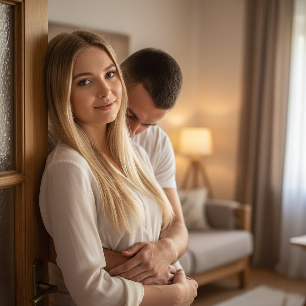 Женщина с распущенными волосами стоит, прислонившись к дверному косяку, её партнёр обнимает её сзади за талию, его лицо скрыто в её волосах. Она смотрит в камеру с нежной улыбкой. Средний план, тёплая домашняя обстановка.