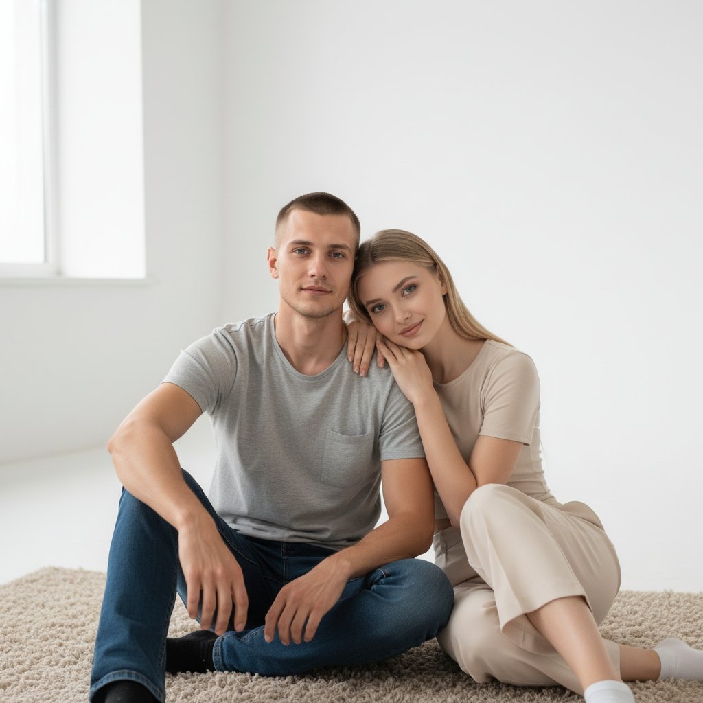 Молодая пара сидит рядом на ковре в светлой, минималистичной студии. Они слегка прислонились друг к другу и смотрят прямо в объектив. Их лица выражают спокойствие, а в воздухе витает атмосфера уюта и доверия. Интерьер студии предельно прост, освещение мягкое и рассеянное.