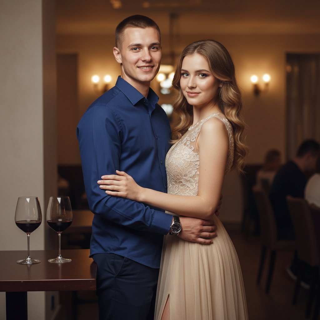 Молодая женщина в элегантном бежевом платье стоит у стола с бокалами. Мужчина в рубашке обнимает её за талию. Оба смотрят в камеру с лёгкой улыбкой. Атмосфера романтики, средний план.