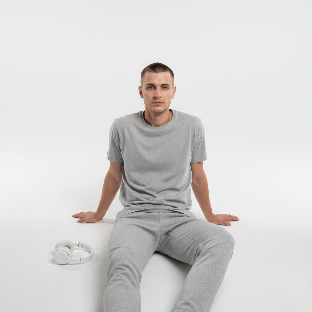 Молодой человек в светлой футболке расположился на полу циклорамы, глядя прямо в объектив. Рядом с ним лежат белые наушники, одна рука опирается о пол, ноги расслабленно вытянуты. Минималистичное пространство, мягкое освещение, естественная поза.