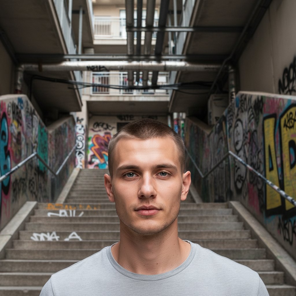 Молодой человек в повседневной одежде позирует на фоне узкой бетонной лестницы в городе. Его взгляд направлен прямо в объектив. Стены украшены граффити, а над головой видны трубы и балконы, создавая атмосферу городского пейзажа.