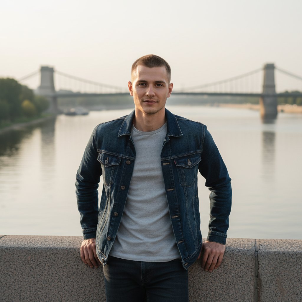 Молодой человек в кэжуал одежде стоит у перил на городской набережной, уверенно смотрит в объектив с легкой полуулыбкой. На фоне — спокойная река, отражения деревьев и городской мост, мягкое естественное освещение, средний план.
