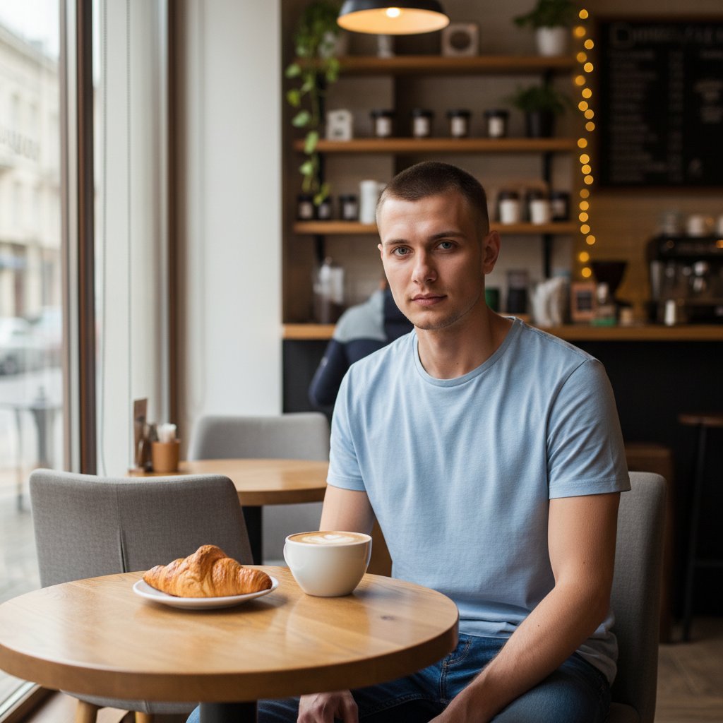 Молодой человек в светло-голубой футболке и темных джинсах сидит за столиком возле окна в приятной кофейне. Перед ним стоит чашка латте и аппетитный круассан. Он смотрит прямо в объектив с сосредоточенным выражением лица. Мягкое, рассеянное освещение, средний план.