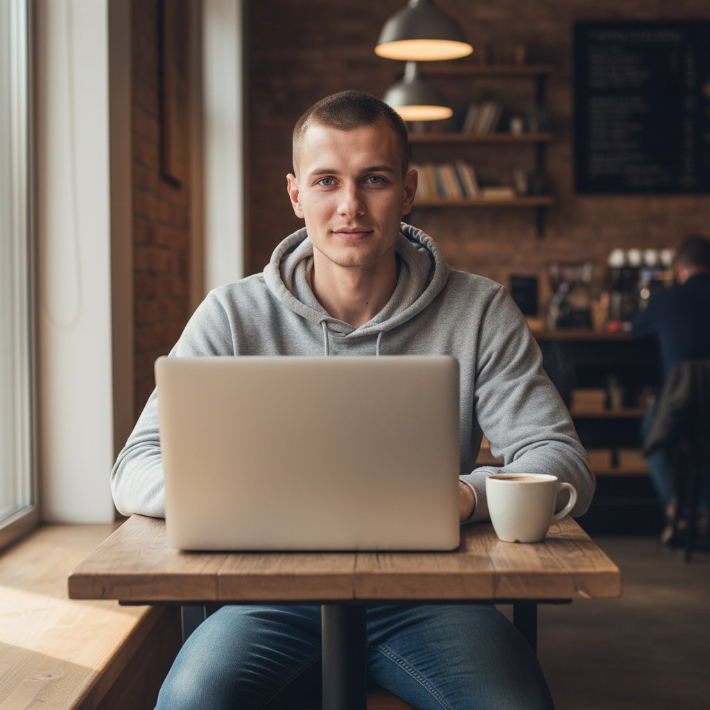 Молодой человек в сером худи и темных джинсах расположился за столиком в атмосферной кофейне. Перед ним открытый ноутбук и чашка ароматного кофе. Он смотрит прямо в объектив, едва заметно улыбаясь. Мягкий дневной свет, средний план.