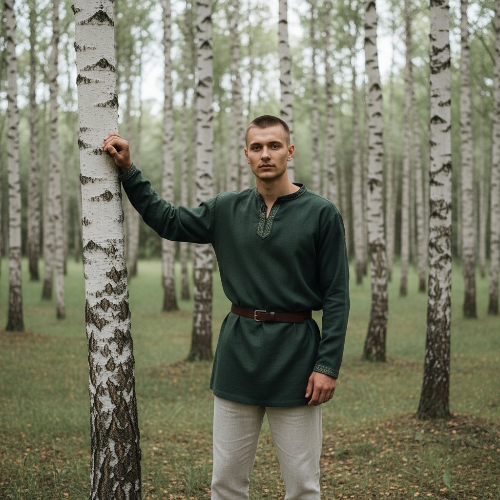 Молодой человек в темно-зеленой рубахе с узором на вороте и светлых брюках, подпоясанный кожаным ремешком, стоит в летнем березовом лесу. Он опирается одной рукой на ствол дерева и смотрит прямо в объектив. Стиль — минимализм. Небо пасмурное, передает ощущение свежести летнего дня.