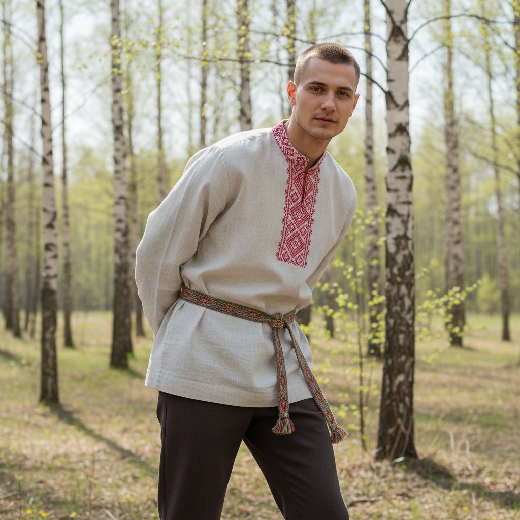 Молодой человек в светлой льняной рубахе с красной вышивкой на вороте, плетеный пояс, темные брюки, короткая стрижка. Он стоит, слегка наклонившись, среди берез, глядя в объектив. Ощущение свежего ветра, минималистичный стиль, весенний день.