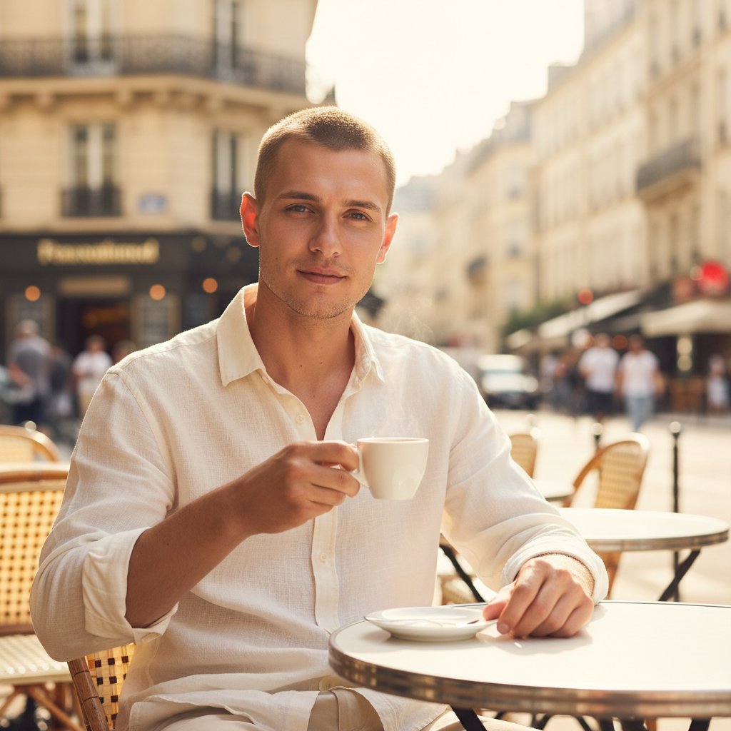 Мужчина в светлой летней одежде, расслабленно сидит за столиком уличного кафе. В его руке — чашка ароматного эспрессо. Солнечные лучи заставляют его слегка прищуриться. На заднем плане — нечеткие силуэты парижских улиц. Крупный план, передающий атмосферу летнего утра в Париже.