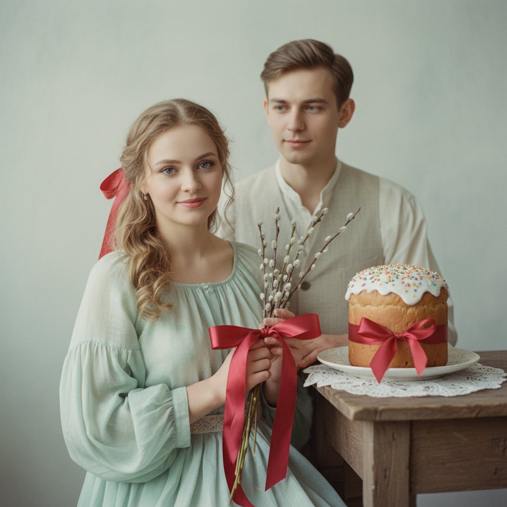 Винтажная православная пасхальная открытка без текста: красивая молодая пара держит нежные пушистые ивовые ветки, перевязанные мягким красным шелковым бантом; девушка в пастельном платье с лентой в волосах; на заднем плане красивый пасхальный хлеб (кулич) с белой глазурью; эстетика мягкой пленочной фотографии; пастельная приглушенная цветовая палитра; романтическая весенняя атмосфера; стиль Pinterest; очень детализированная — ar 3:4