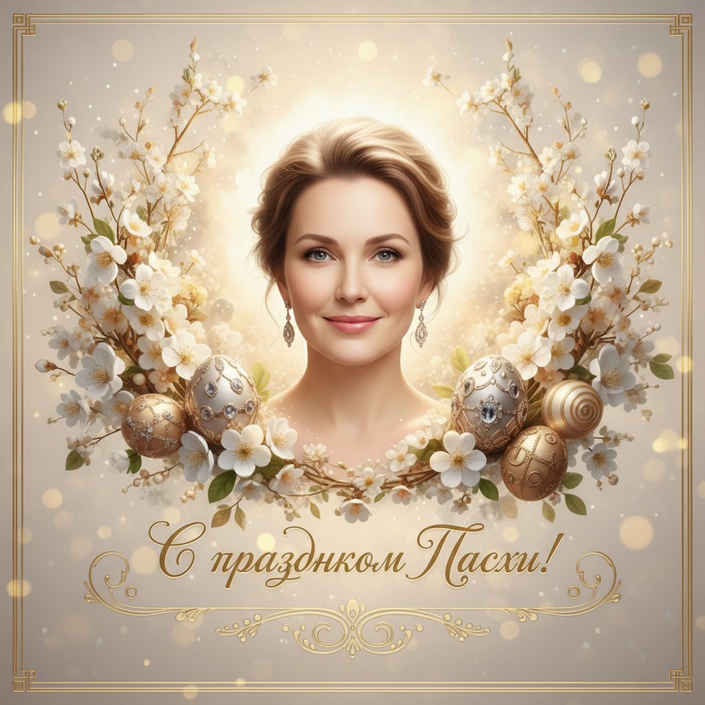 Создай премиальную пасхальную открытку с моим фото. Сохрани естественное сходство и красивую портретную подачу. Добавь изысканный фон с цветами, свечением, декоративными яйцами, золотыми элементами и мягкими световыми акцентами. Стиль — дорогая дизайнерская открытка, гармоничная композиция, высокий уровень детализации. Надпись: “С праздником Пасхи!”