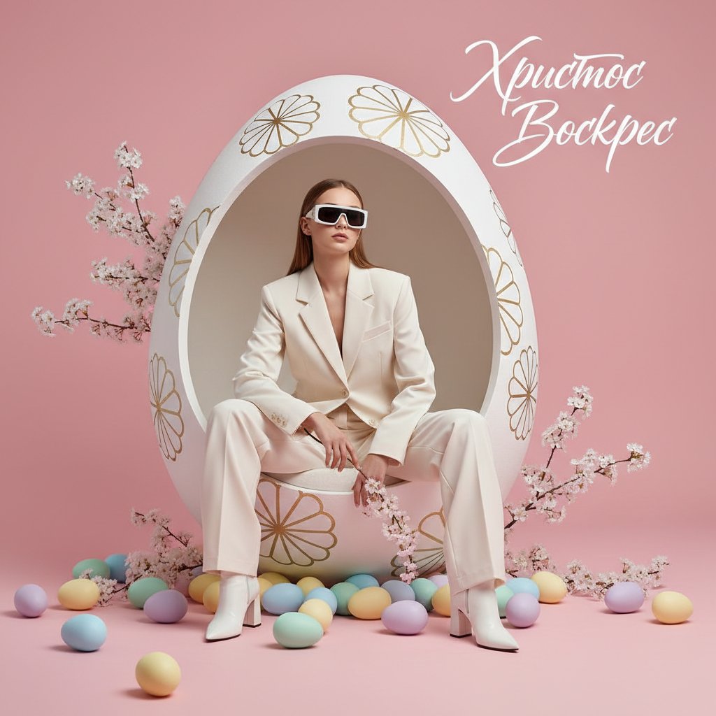 Создай стильную fashion-сцену в минималистичном пасхальном стиле. Молодая женщина в светлом костюме сидит в большом декоративном яйце на розовом фоне. Вокруг лежат пастельные пасхальные яйца и цветущие ветви сакуры. Девушка в модных очках и белых ботильонах, поза уверенная и элегантная. Композиция современная, модная и минималистичная. Стиль — fashion editorial, pastel aesthetic, studio lighting, photorealistic, high detail, 4k. Добавь стильную дизайнерскую надпись: «Христос Воскрес».