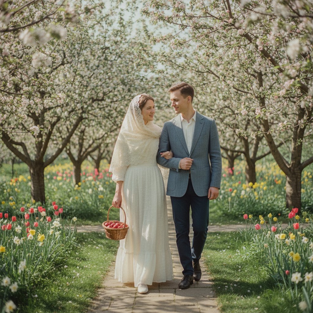 Винтажная православная пасхальная открытка без текста: молодая пара гуляет вместе в цветущем весеннем саду; девушка в нежном кружевном платке; держит маленькую винтажную плетеную корзинку с яйцами, окрашенными в темно-красный цвет; эстетика мягкой пленочной фотографии; пастельная приглушенная цветовая палитра; романтическая весенняя атмосфера; стиль Pinterest; очень детализированная — ar 3:4