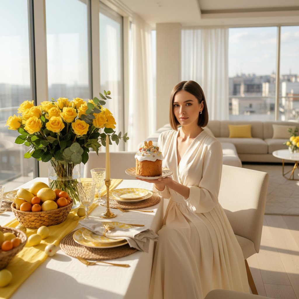 Создай элегантный пасхальный портрет молодой женщины в современном светлом интерьере с панорамными окнами. Девушка с гладким каре в кремово-белом платье сидит у празднично сервированного стола и держит на тарелке большой кулич с белой глазурью и декором. На столе — желтые и золотистые акценты, свеча, красивая посуда, корзина с фруктами и декоративными яйцами. Рядом стоит роскошный букет желтых роз в стеклянной вазе. Атмосфера стильная, солнечная, дорогая и праздничная. Стиль — luxury lifestyle, elegant editorial photography, soft daylight, refined composition, photorealistic, highly detailed, 4k.