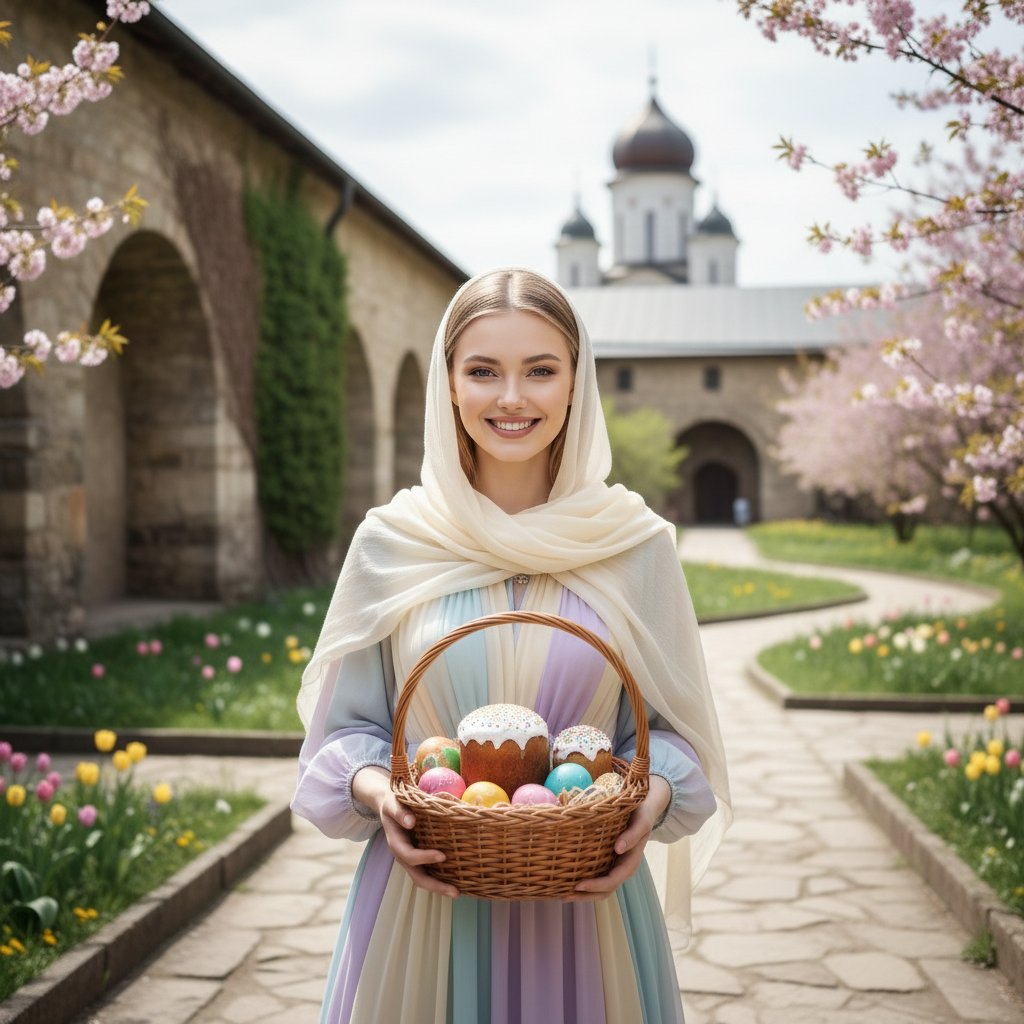 Женщина в пастельном наряде и светлом платке, с корзиной пасхальных угощений в руках, идет по тропинке в умиротворенном монастырском саду. Ее взгляд направлен в объектив, на лице сияет искренняя радость. На заднем плане виднеются стены обители и колокольня. Снимок крупным планом, подчеркивающий атмосферу святости и чистоты праздника.