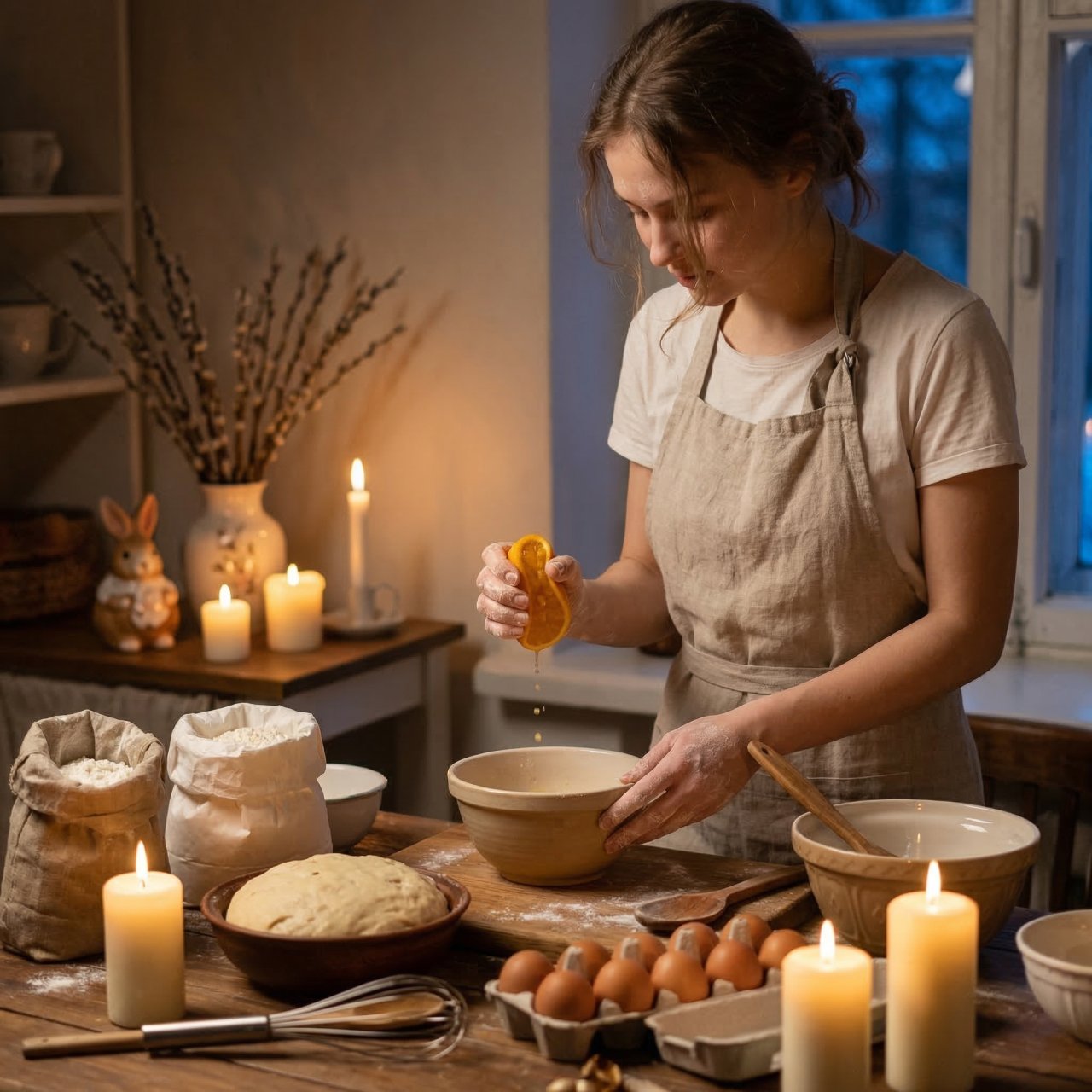 NanoBanana ProСоздай уютную вечернюю пасхальную сцену на кухне. Молодая женщина готовит тесто для кулича и выжимает апельсин в миску. В воздухе летят капли сока. На столе лежат яйца, мука, миски и кухонная утварь. Рядом горят свечи, создавая теплое золотое освещение. На фоне стоит декоративный кролик и пасхальный декор. Атмосфера домашняя, теплая и немного кинематографичная. Стиль — cinematic lighting, cozy baking scene, warm candlelight, rustic kitchen aesthetic, photorealistic, highly detailed, 4k.