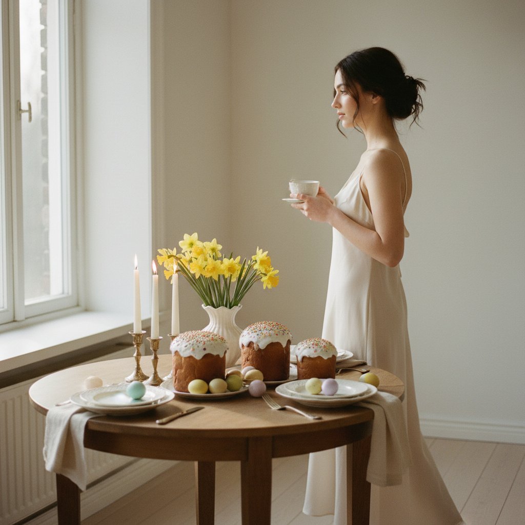 Создай атмосферный пасхальный интерьерный портрет молодой женщины у окна. Девушка с темными волосами, собранными в небрежную прическу, стоит вполоборота у круглого стола возле светлого окна, держа чашку в руках. На ней нежное светлое платье с тонкими бретелями и открытой спиной. На столе — праздничная пасхальная сервировка: куличи с глазурью, яйца, белая посуда, свечи, столовый текстиль и композиция из желтых нарциссов в белой вазе. Свет мягкий, утренний, естественный, создающий спокойную домашнюю атмосферу. Стиль — quiet luxury, soft natural window light, fine art lifestyle photography, photorealistic, minimal elegant интерьер, 4k.