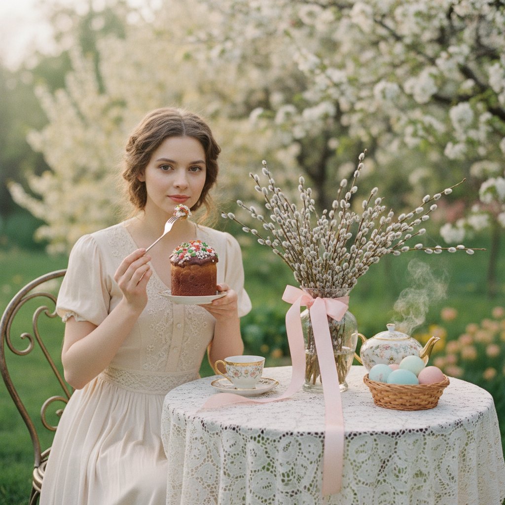 Винтажная православная пасхальная открытка без текста: красивая молодая женщина наслаждается кусочком сладкого кулича за винтажным садовым столиком, пьет чай из изящной фарфоровой чашки; пушистые ивовые ветки в вазе, перевязанные нежно-розовыми лентами; эстетика пленочной фотографии; мечтательная пастельная цветовая палитра; романтическая весенняя атмосфера; стиль Pinterest; очень детализированная — ar 3:4