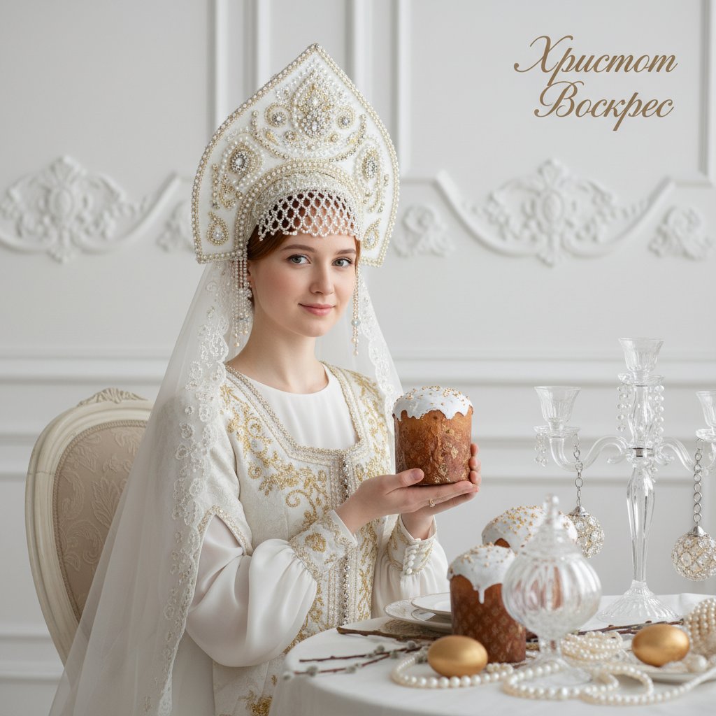 Создай нежный пасхальный портрет молодой женщины с рыжими волосами в бело-золотом русском народном образе. Девушка сидит за праздничным столом в светлом классическом интерьере с декоративной лепниной. На ней роскошный белый кокошник, украшенный золотой вышивкой, жемчугом и камнями, а также полупрозрачная белая вуаль и светлый элегантный наряд. В руках она держит высокий кулич с белой глазурью. На столе расположены пасхальные куличи, золотые яйца, жемчужные украшения, стеклянный подсвечник или стеклянный декор и веточки вербы. Атмосфера утонченная, светлая, спокойная, праздничная и благородная. Мягкий студийный свет, высокая детализация, реалистичная фотосъемка, fine art portrait, luxury editorial, photorealistic, 4k. Добавь элегантную каллиграфическую надпись: «Христос Воскрес».