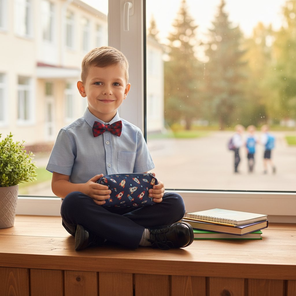 Первоклассник у окна с пеналом