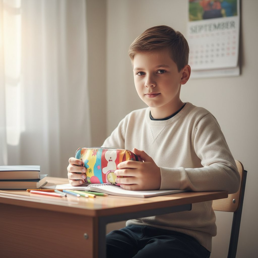 Ученик в школьной форме (светлый джемпер, темные брюки) сидит за партой на светлом фоне. В руках у него яркий пенал. Взгляд уверенный, направлен в камеру. Атмосфера начала учебного года.