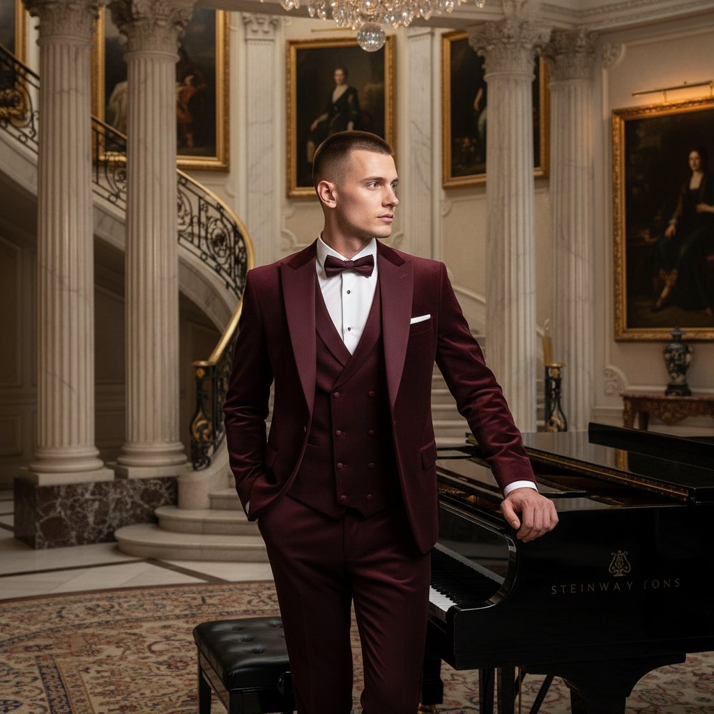 Элегантный мужчина в бордовом бархатном костюме позирует у рояля в роскошной гостиной с колоннами. Его взгляд устремлен в сторону, одна рука касается крышки пианино. На заднем плане виднеется мраморная лестница и внушительные картины в золотых рамах. Мягкое освещение подчеркивает его утонченность и детали интерьера.