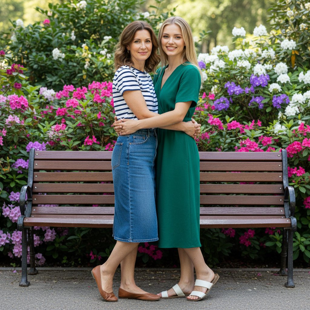 Две подруги средних лет обнимаются на фоне парковой скамейки и цветущих кустов, смотрят в камеру. Одна одета в изумрудное платье-миди и белые босоножки, другая — в джинсовую юбку, полосатую рубашку и коричневые балетки. Легкие улыбки, расслабленные позы.