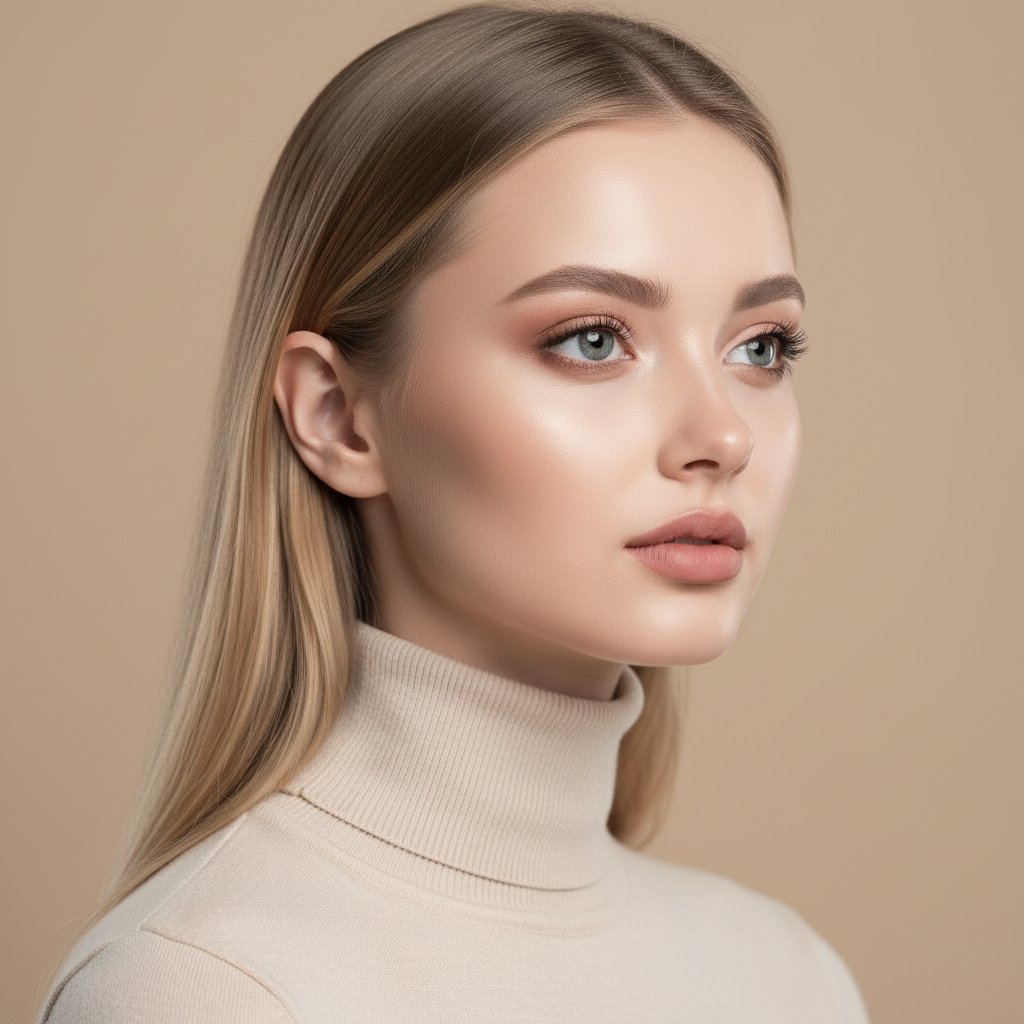 Крупный план портрета девушки в светло-бежевом гольфе. Она слегка повернута в профиль, подбородок приподнят. Макияж выполнен в натуральных тонах: мягкий контуринг, смоки-айс и матовая нюдовая помада. Фон – однотонная бежевая циклорама, гармонирующая с образом.