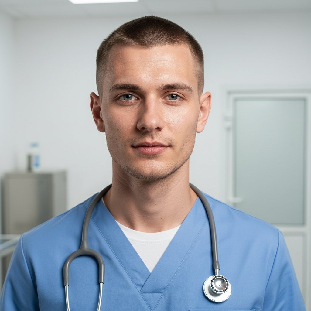 Портрет молодого специалиста в медицинском одеянии, с акустическим прибором на шее, уверенный взгляд в объектив. Сцена разворачивается в залитом светом кабинете, на заднем плане — нейтральная обстановка. Мягкое студийное освещение, атмосфера профессиональной фотосессии.