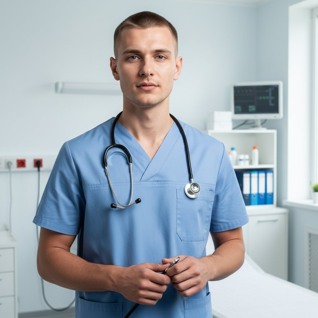 Молодой специалист в медицинском одеянии позирует в залитой светом комнате для осмотров, держа в руках стетоскоп. Взгляд направлен прямо на зрителя, обстановка наполнена профессионализмом и современным оборудованием.