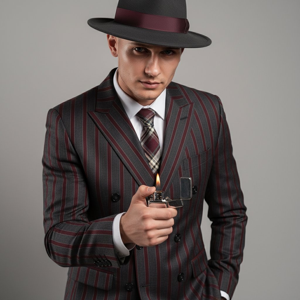 Мужчина в элегантном двубортном костюме бордовых и серых тонов, классических брюках со стрелками, белоснежной рубашке и галстуке в клетку. На голове винтажная шляпа. Он слегка наклонился вперед, держа в руке металлическую зажигалку Zippo. Снято крупным планом, взгляд направлен прямо в объектив.
