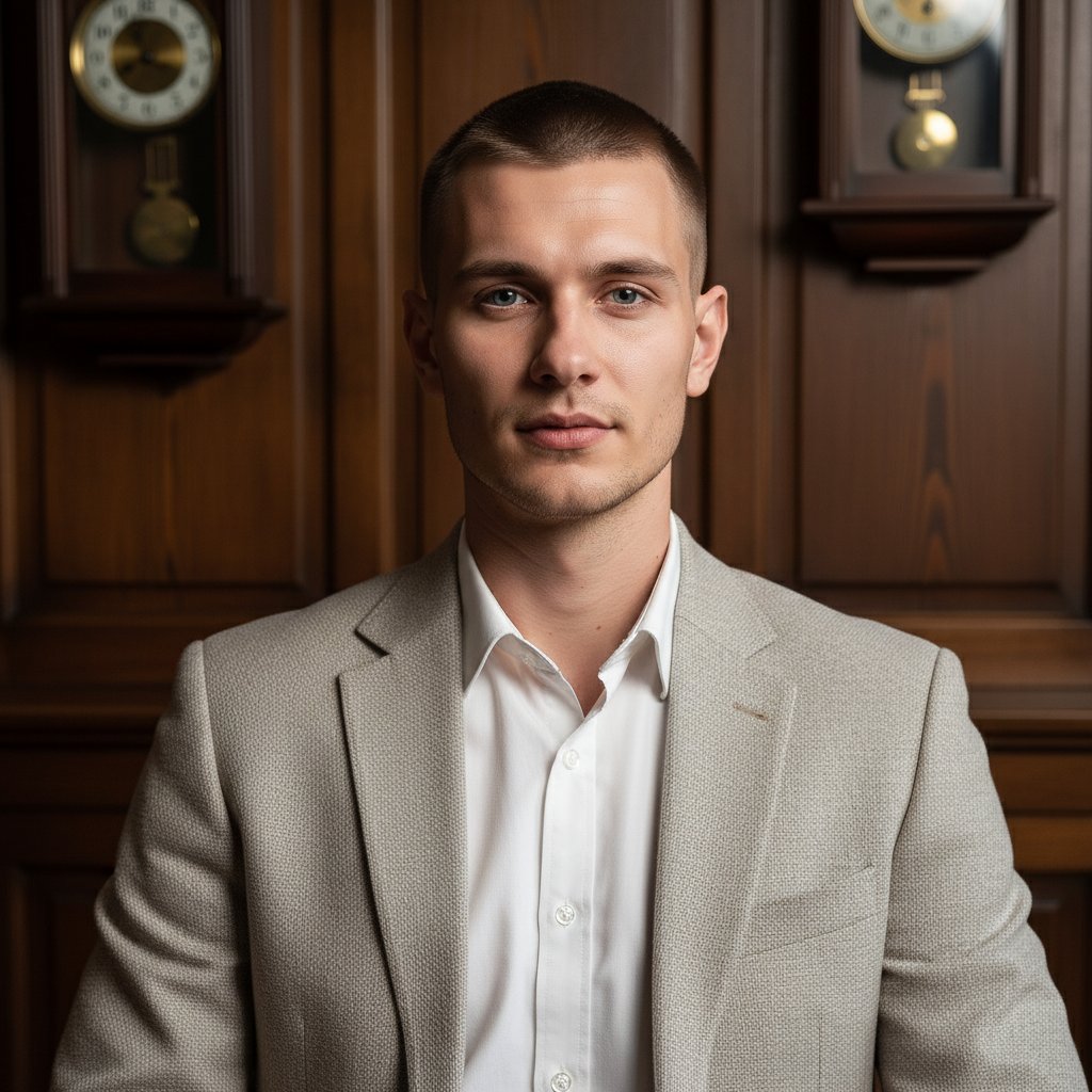Молодой человек с ухоженной прической и легкой щетиной, в светло-бежевом твидовом пиджаке и белой рубашке без галстука. Он сидит на фоне старинных деревянных панелей кабинета, где видны викторианские часы. Взгляд спокойный и уверенный, направлен в объектив. Показана верхняя часть тела.
