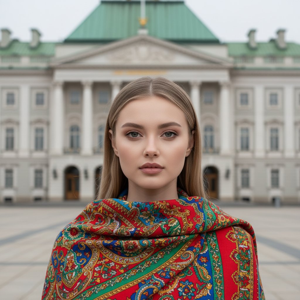 Фотография женщины в красочном шарфе, стоящей перед президентским дворцом. В кадре видны величественные колонны и зеленая крыша здания. Женщина смотрит прямо в объектив.