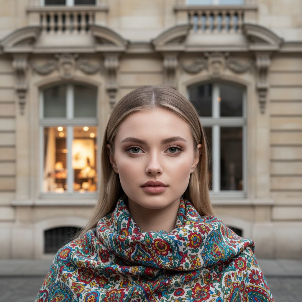 Женщина, одетая в пестрый шарф, позирует на фоне фасада старинного здания с декорированными окнами. Она смотрит прямо в объектив. За ее спиной видна витрина с внутренним освещением.