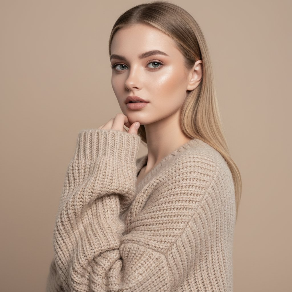 Крупный план: женщина в объемном кардигане бежевого цвета, повернута наполовину к зрителю. Легкое касание пальцами подбородка, взгляд направлен прямо в объектив. Макияж акцентирует брови и скулы, губы с мягким контуром, матовые, нюдового оттенка. Фон — нейтральная бежевая циклорама.