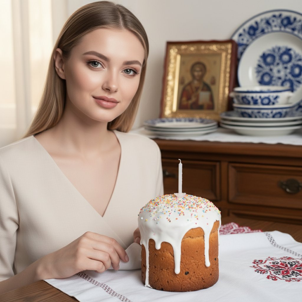 Женщина с мягкой улыбкой сидит за накрытым столом. Перед ней стоит кулич, украшенный глазурью и свечой. Она поправляет скатерть, её взгляд устремлён прямо в объектив. На заднем плане видна православная икона и посуда с русскими узорами. Крупный план, передающий атмосферу уюта и православных традиций.