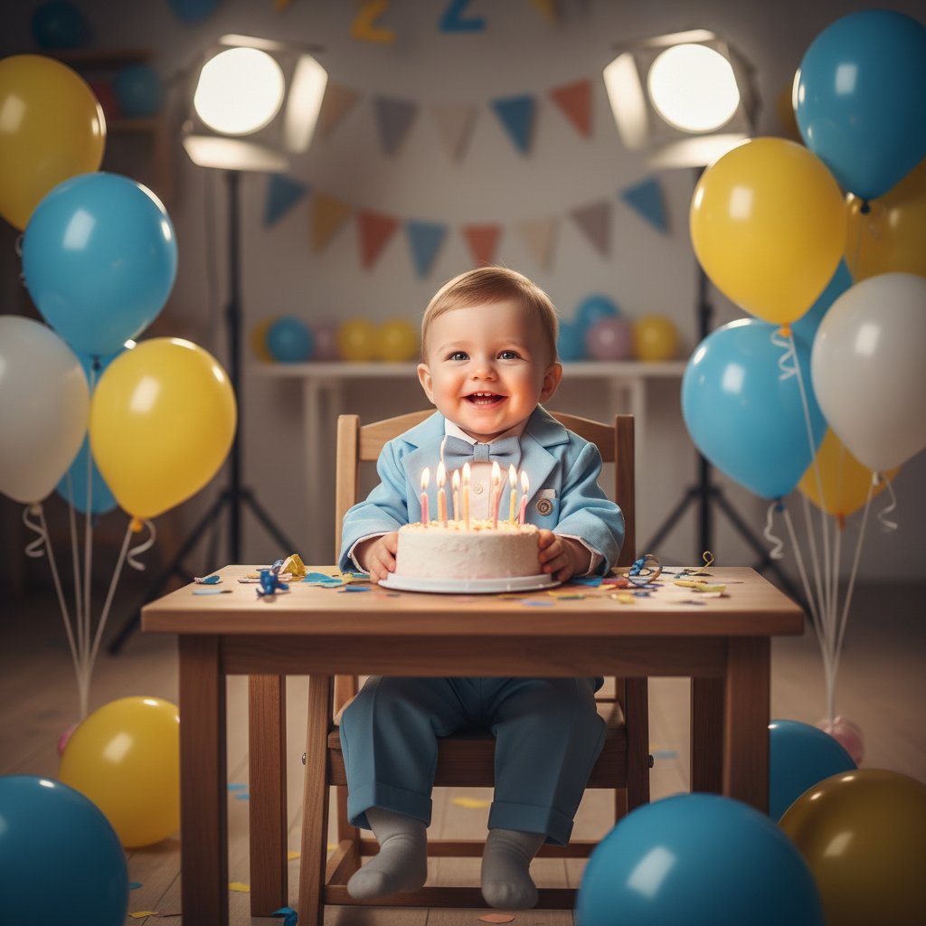 Малыш в нарядной одежде у стола, украшенного воздушными шарами, держит праздничный торт с горящими свечами, смотрит в камеру с улыбкой, освещение яркое, атмосфера полна радости.