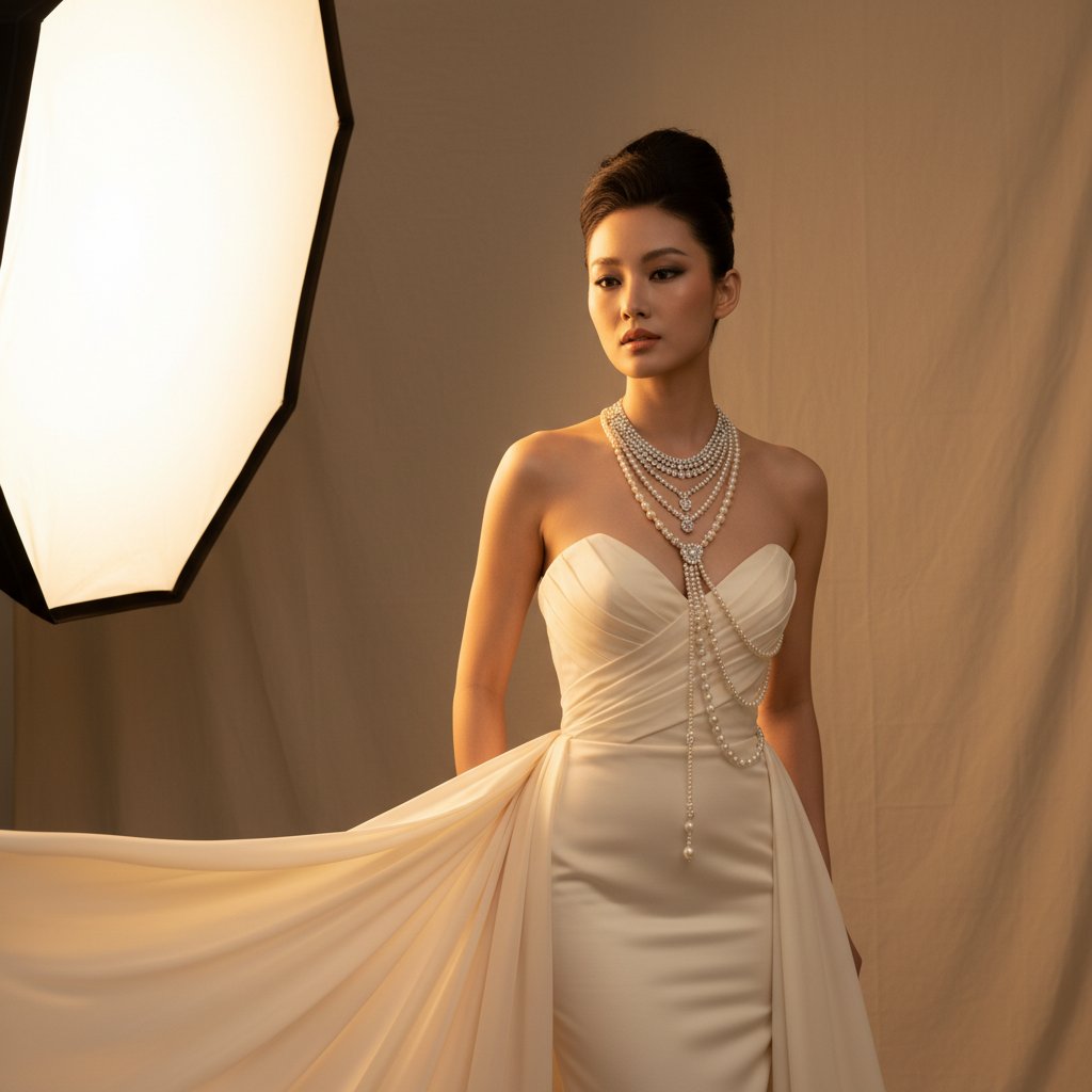 Высокомодный студийный портрет женщины в элегантном платье без бретелей и роскошном ожерелье, мягкое направленное освещение, теплые тона, чистый фон, редакционная съемка красоты, идеальная кожа, минимум теней, фотореализм.